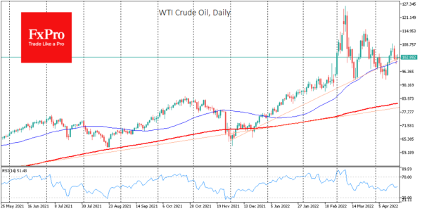 Oil gained 1.5% on Thursday morning to $103.75 per barrel for WTI and $108.2 for Brent, continuing to cling to the uptrend since December. Over the past six weeks, oil price movements are no longer unidirectional, but the market remains in ‘crisis mode’. In April, oil is supported on the declines towards the 50-day moving average, as we saw yesterday.
