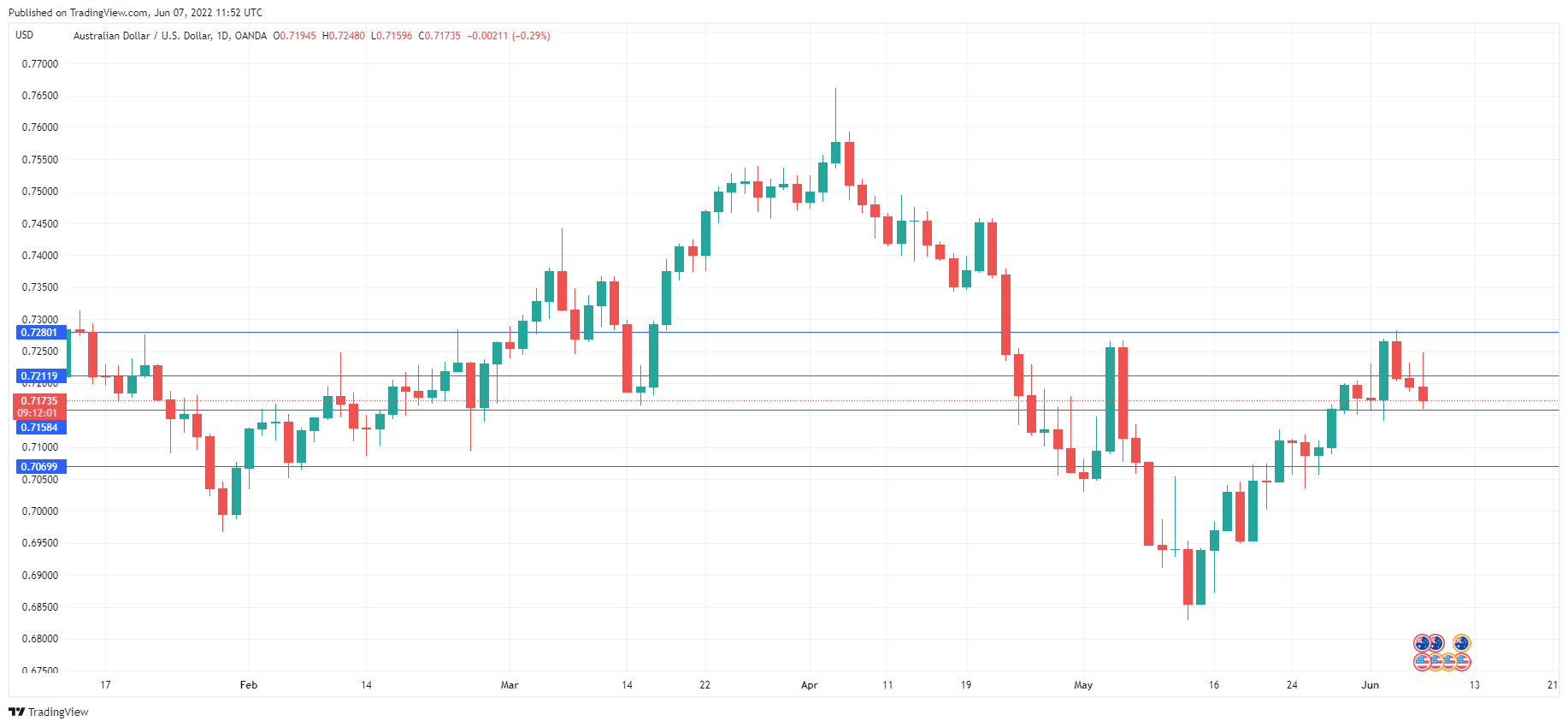 - 0.7158 is under pressure in support. Below, there is support at 0.7069