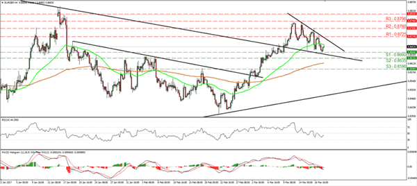 EUR/GBP got hit by Friday’s poll as well and slid from 0.8725 (R1) to hit support at 0.8660 (S1), near the downside resistance line drawn from the peak of the 11th of October. The fact that the rate is still trading above that line leaves the door open for the bulls to enter the market and push the pair higher. Nevertheless, we would like to see a decisive break above the upper bound of the falling wedge that has been in place since the 10th of March before we get confident on such a rebound. The trigger for such a break could be a poor showing by Le Pen in today’s debate.