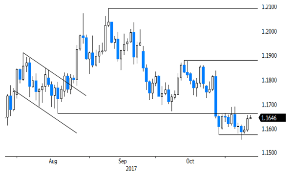 Global markets were spooked by an unexpected uptick of volatility on equity markets yesterday. At the same time, Bunds and, to a lesser extent Treasuries, came under pressure. The dollar and the euro both received interest rate support, despite the equity correction. This prevented a meaningful gain of the usual safe havens (Japanese yen, Swiss franc). Later in the session, the dollar ceded ground as more details on the Senate tax plan were aired. EUR/USD finished the session at 1.1642 (from 1.1595). USD/JPY finished the session at 113.47.