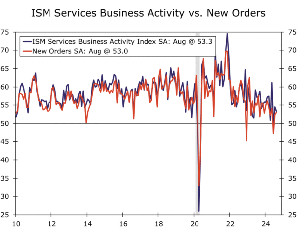 Inflation is still on the mind of policymakers, even if the labor market has garnered more attention. We’ll get the consumer price index report next week for August, but the ISM services prices paid metric reported today rose in August to a three-month high of 57.3. That may not be problematic for policymakers. For many services companies the biggest cost is labor, so the cooling in the labor market may lead to continued improvement in service prices, a key indicator for the Fed in this cycle.