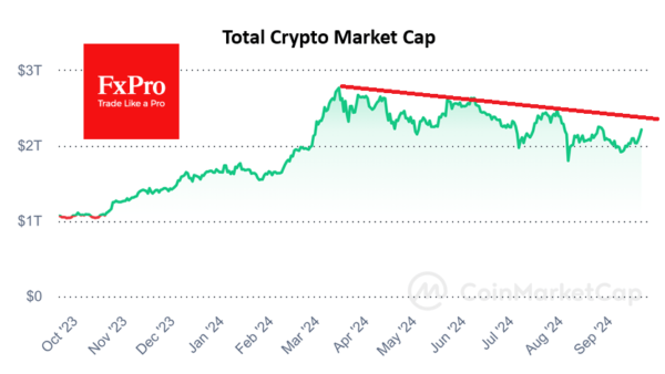 Active buying continues in the crypto market, with its total cap rising 3.2% in 24 hours to $2.21 trillion, reviving the fight to break the previous local high of $2.27 trillion a month ago. The local low in early September was above the previous low, and a break of the recent highs could provide fresh buying momentum and signal a break in the multi-month downtrend.