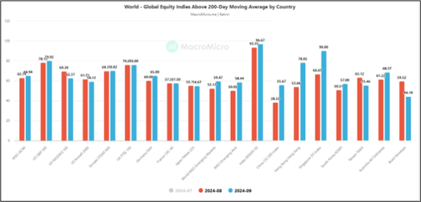 Fig 3: Month-on-month comparison on the percentage of stocks above 200-day MA for global benchmark stock indices as of 27 Sep 2024 (Source: Macro Micro, click to enlarge chart)