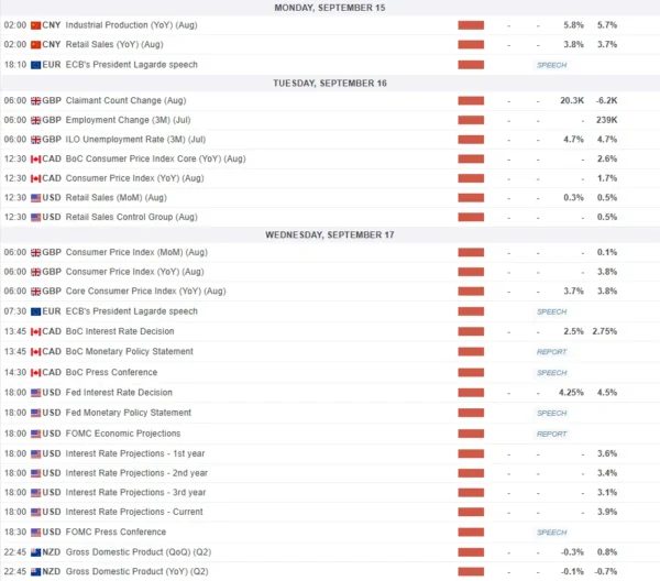 China will publish its August numbers on Monday. Retail sales are expected to bounce back, around 4% higher than a year ago. At the same time, industrial output probably keeps slipping, perhaps down 5.6% year‑over‑year. Fixed‑asset investment may also fall, about 1.5% down so far this year.