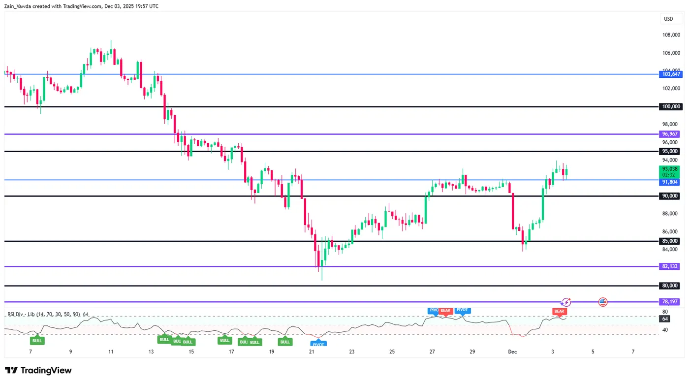 Bitcoin (BTC/USD) has successfully rebounded, passing the important $93,000 price point that many market participants have been watching. This comeback is seen as a necessary relief rally, pushing Bitcoin’s price up to $93,007.12, which marks a 6.6% increase in just the last 24 hours.