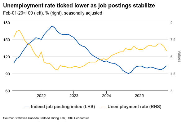 Job postings data suggest hiring demand has stopped weakening and may be recovering modestly. And growth in the available labour force will continue to slow as federal government caps on temporary residence visas reduce population growth. The population aged 15+ already posted its smallest increase since May 2021 in November and highly likely slowed further in December given a reported pullback in total population in Q3.