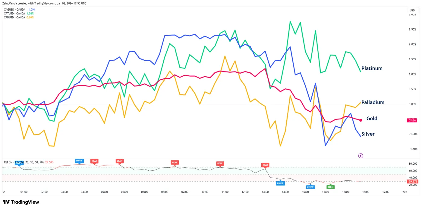 Silver is down around the 1% mark on the day while Platinum is up just over 1%.