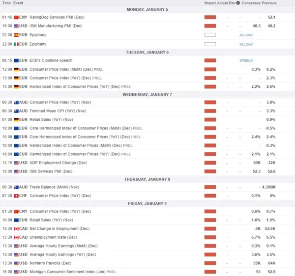 Market participants are closely monitoring the Bank of Japan this week. While the bank is expected to proceed cautiously, new wage data arriving on January 7 could speed up interest rate hikes if earnings are higher than expected, which would strengthen the Japanese Yen.