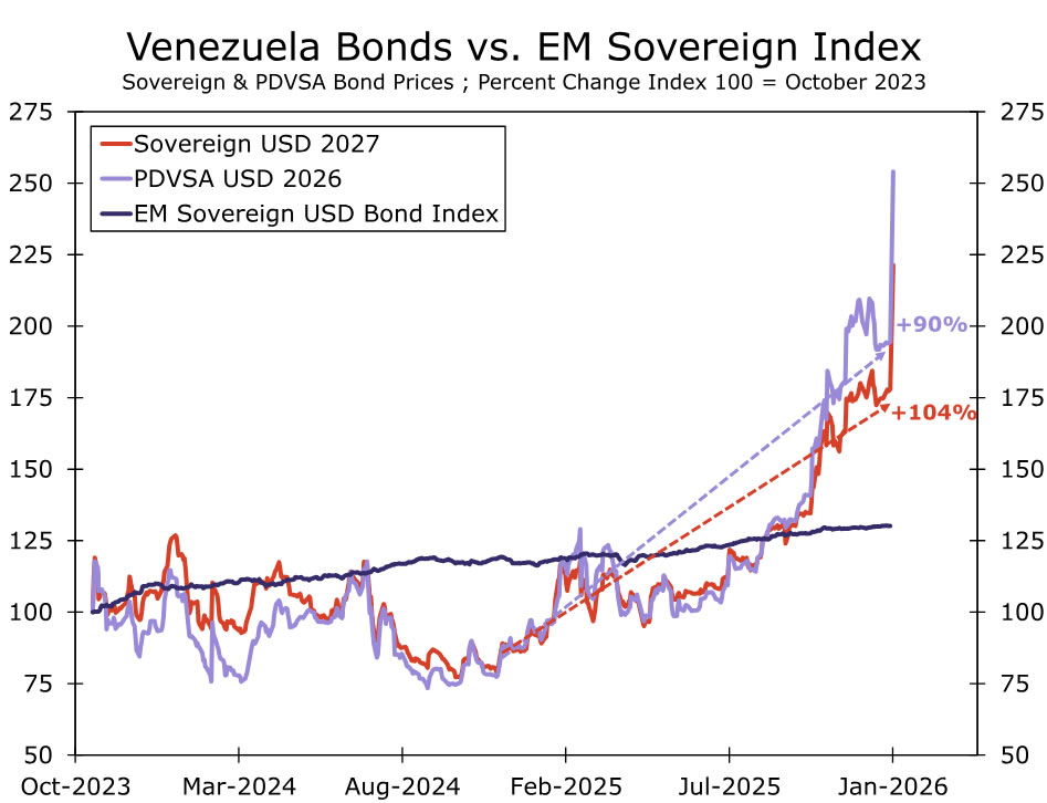 Venezuelan sovereign and PDVSA debt, both of which are currently in default, have been some of the best performing assets since the Trump administration took office in January 2025, essentially doubling in value over the past 12 months (Figure 1). Just about all EM assets rallied last year, but the degree of Venezuelan asset outperformance, in our view, stems from market participants pricing a rising degree of confidence in a Venezuela regime change scenario. This confidence seemingly grew as U.S. military activity in the region picked up pace late last year. The significant outperformance in Venezuela asset prices suggest market participants were unlikely to be caught off guard that a regime change scenario is now in motion, even if this scenario is in infant stages and the future remains far from certain.