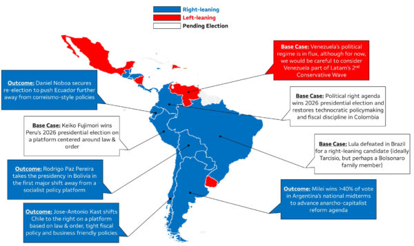 Latin America’s broad decline in regional political risk should be uninterrupted? Over the past 12-18 months, general and congressional elections across Latin America have yielded broad support for right-leaning political platforms. This trend has been on display in traditional left-leaning strongholds such as Ecuador, Bolivia and Argentina, and most recently in Chile and Honduras where conservative politicians won their respective general elections. We have noted in multiple publications (See: Unwinding the Tide. Latin America’s Shift to the Political Right 6/11/2025Latin America Elections Outlook 8/1/2025Latin America Elections Outlook. The Shift to the Political Right is in Motion 11/7/2025)  how Latin America is in the midst of a second “Conservative Wave” and how regional political risk is set to decline as a result of these latest election trends (Figure 3). In our view, while Venezuela-related uncertainty will likely linger for an extended period of time, the softening in political risk associated with Latin America is likely to continue going forward.