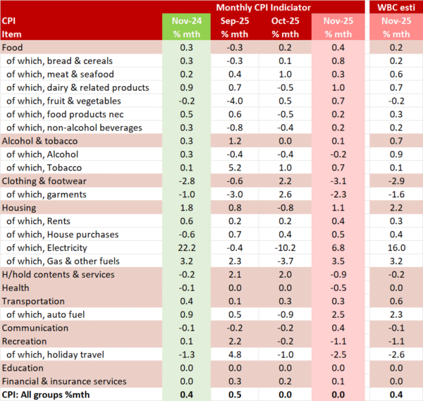 November’s headline figure was flat in the month, softer than Westpac’s published near-cast of 0.4% on the back of a smaller than expected rise in electricity (6.8% vs 16.0% estimated), a larger than expected fall in household contents & services (–0.9% vs –0.2% estimated), clothing & footwear (–3.1% vs. –2.9% estimate) and health (–0.5% vs. 0.0% expected), a smaller than expected rise in transport (0.3% vs. 0.6% forecast) to be partially offset by stronger gains in food (0.4% vs 0.2% estimated), rents (0.4% vs 0.3% estimated), dwellings (0.5% vs 0.4% estimated) and communication (0.4% vs. –0.1% estimated).