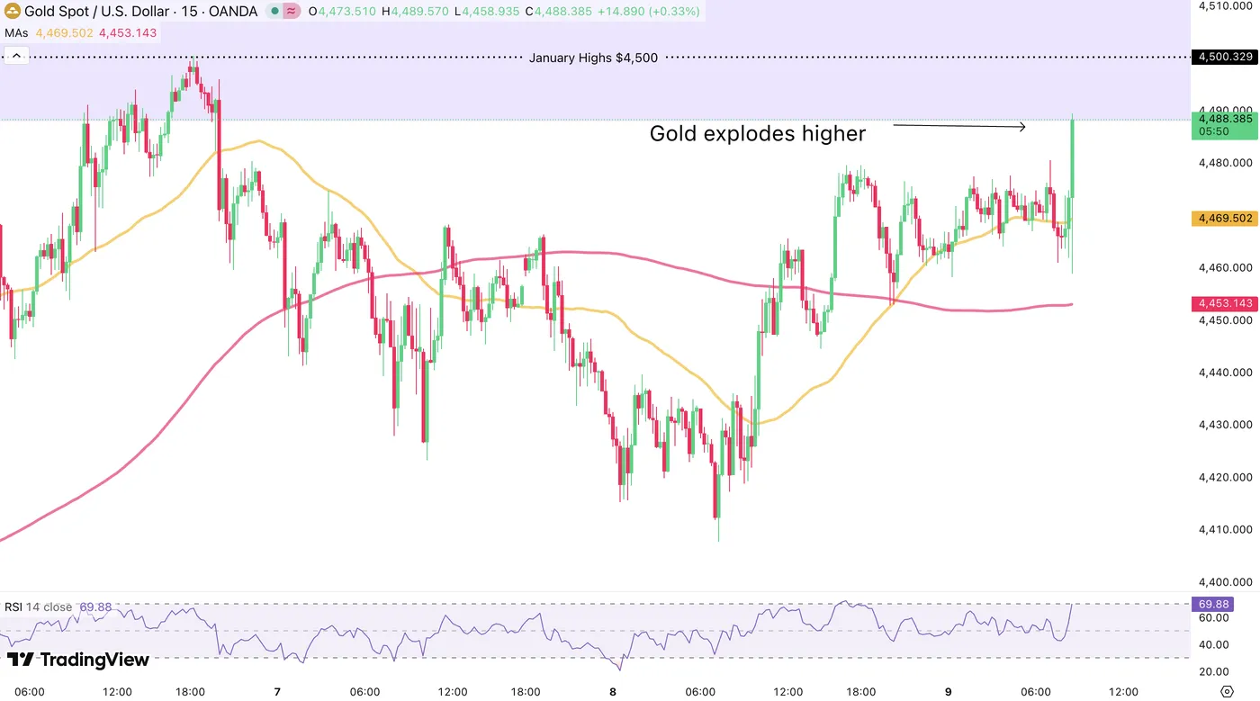 Gold (XAU/USD) 15 min Chart – January 9, 2026. Source: TradingView