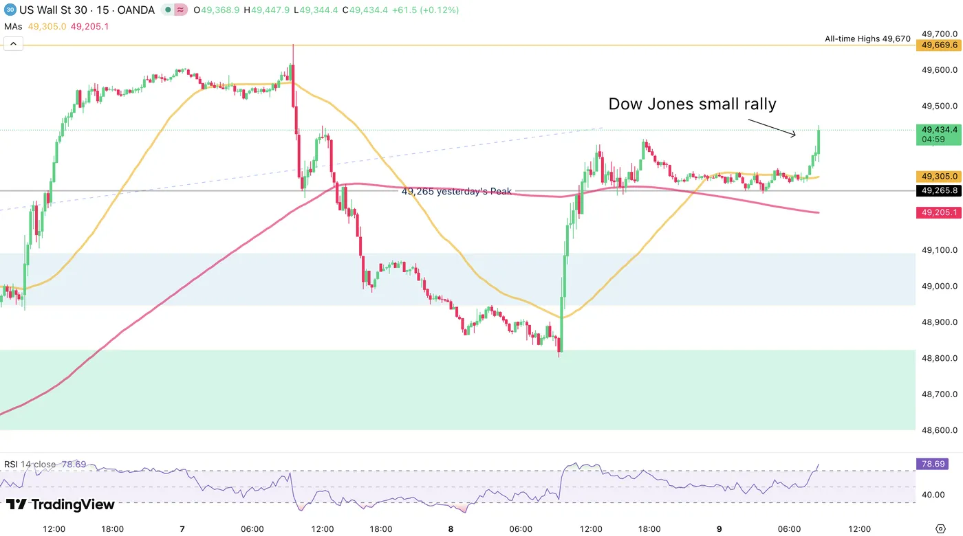 Dow Jones 15 min Chart – January 9, 2026. Source: TradingView
