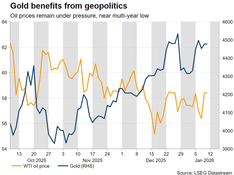 Both gold and oil have been quite responsive to the geopolitical developments, moving in opposite directions. Gold rallied towards the $4,500 level before correcting lower, partly dragged by silver’s erratic behaviour, while oil has been drifting lower as the excess supply story for 2026 could get even worse if US firms gradually restore the flow of Venezuelan oil. Coupled with decent chances of a Ukraine-Russia ceasefire, the outlook remains bleak for the oil market, with the five-year low of $55.19 around the corner.