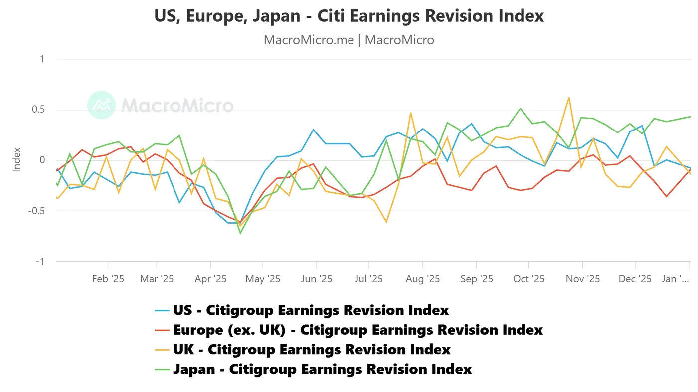 Fig. 2: Citigroup Earnings Revision Index (Japan, US, Europe, UK) as of 2 Jan 2026 (Source: MacroMicro)