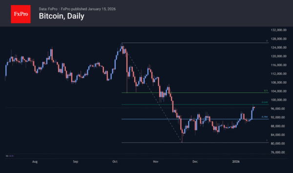 Bitcoin rose to $98K on Wednesday, gaining for the third day during the US session, while Asian and European trading saw a correction and lull, respectively. The price of BTC touched the 61.8% level of the decline from the peak of $126K to the November lows of $80K. Further growth from these levels, especially exceeding $100K, will be an important signal that the decline in October and November may have been a deep correction, but did not break the bull market.
