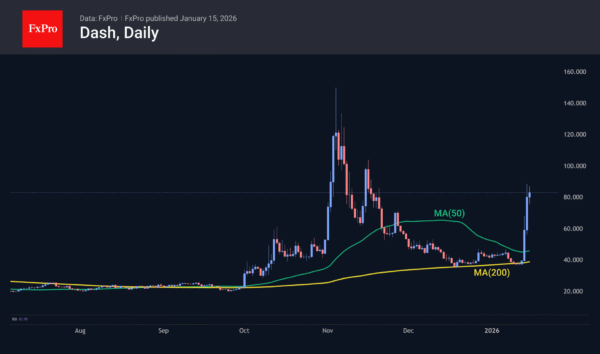 The relatively small Dash coin is experiencing an impressive rally, gaining over 130% since the beginning of the week. Technically, buyers pushed off the 200-day moving average, which had been providing support since September. The last comparable rise in scale was in early November, after which the price fell even lower over the next month and a half. It seems that the main reason for the growth is insufficient liquidity and the pump & dump approach, rather than the start of the alt season.