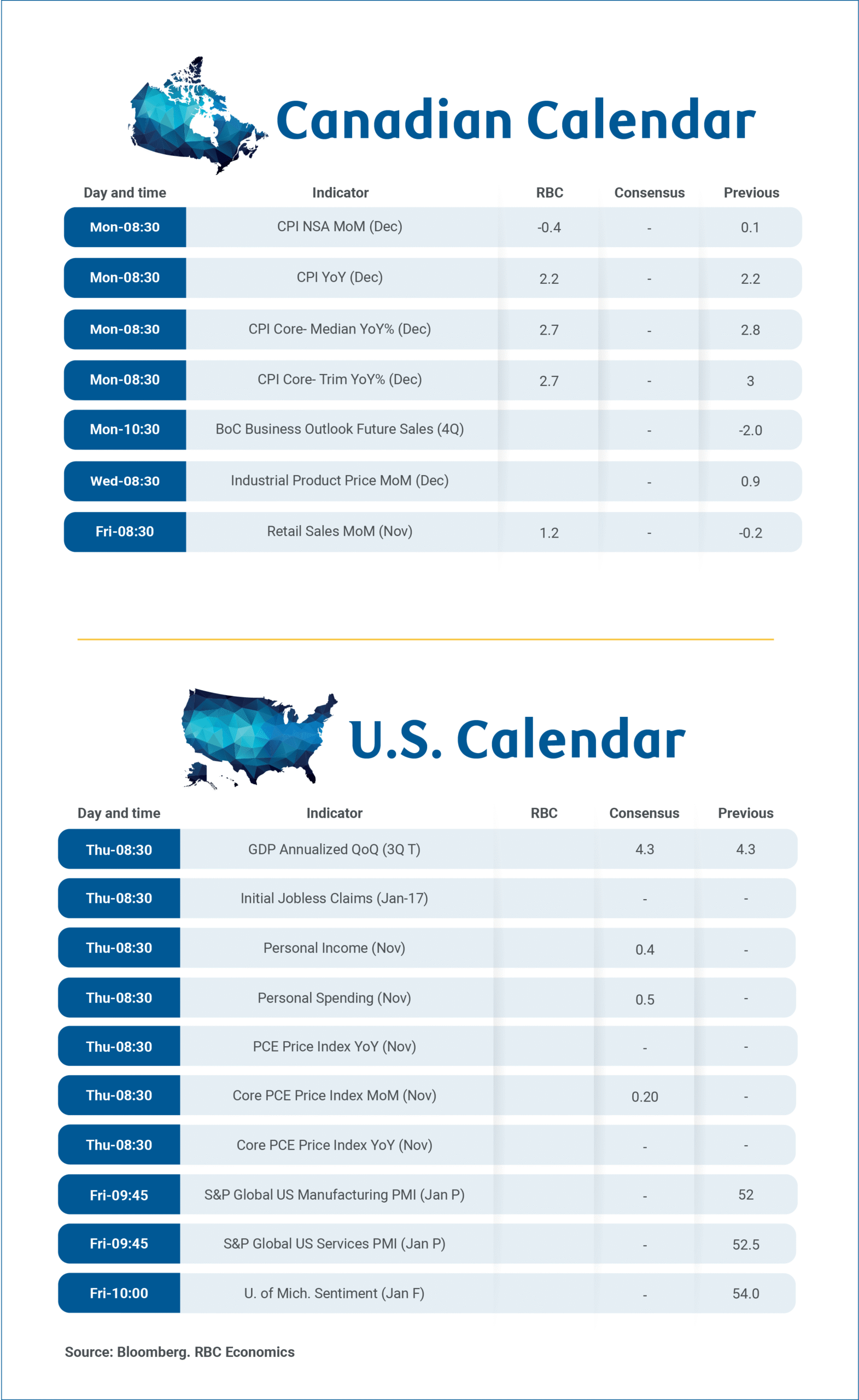 There’s a full slate of Canadian data releases in the coming week kicking off with the final monthly inflation report for 2025 and the Bank of Canada’s closely watched Business Outlook Survey for Q4 on Monday, along with November’s retail sales on Friday.