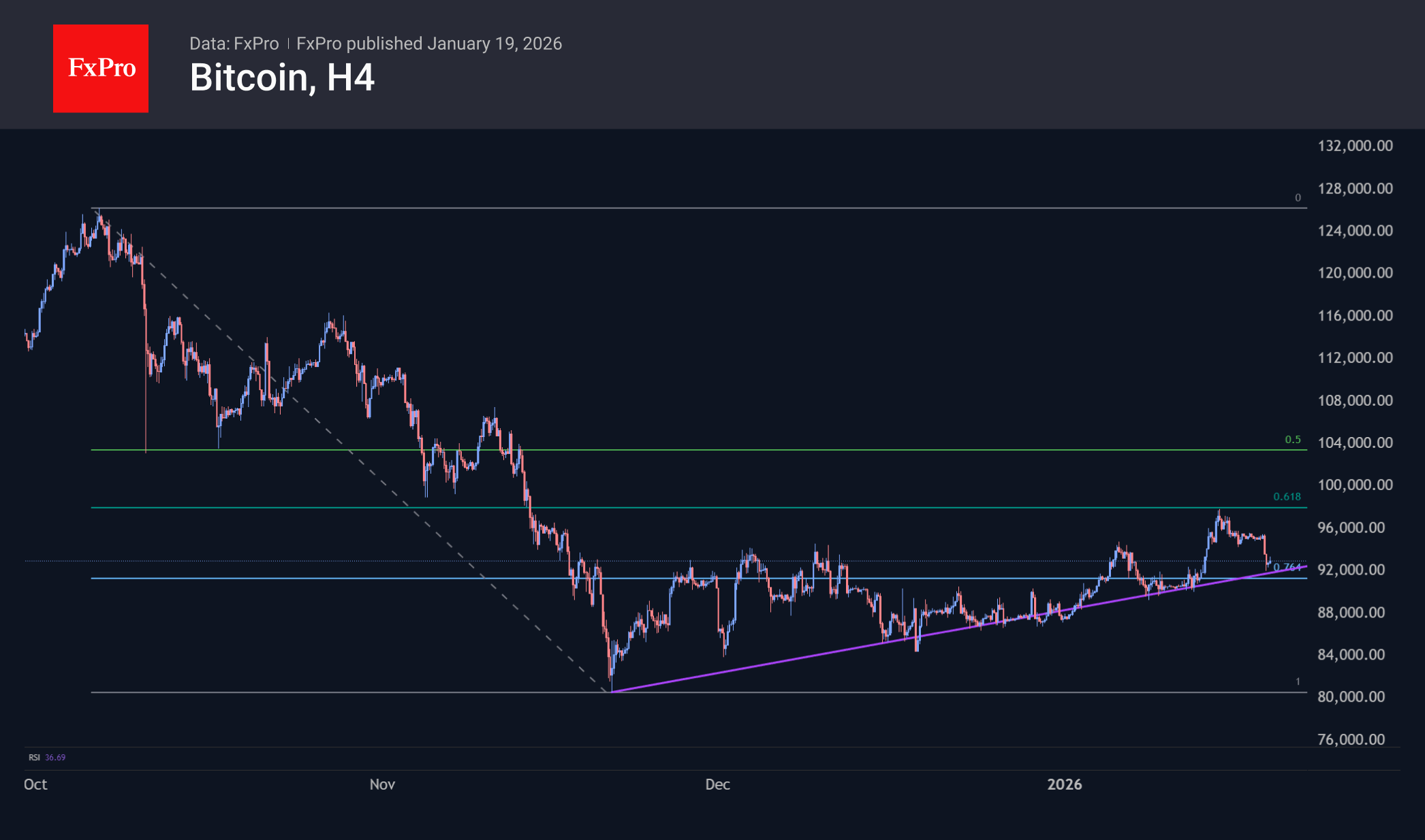 Bitcoin plunged 3.8% shortly after the opening of trading in Asia, reducing losses to 2.5% during trading in Europe. Bears are pushing their agenda, forming powerful downward momentum during the lowest liquidity. This allows them to form frightening candlesticks on the charts and trigger stop orders. Technically, the first cryptocurrency remains within the rebound range after the October-November sell-off. At the same time, the downward momentum has not broken the upward trend passing through the lows of November and December last year.