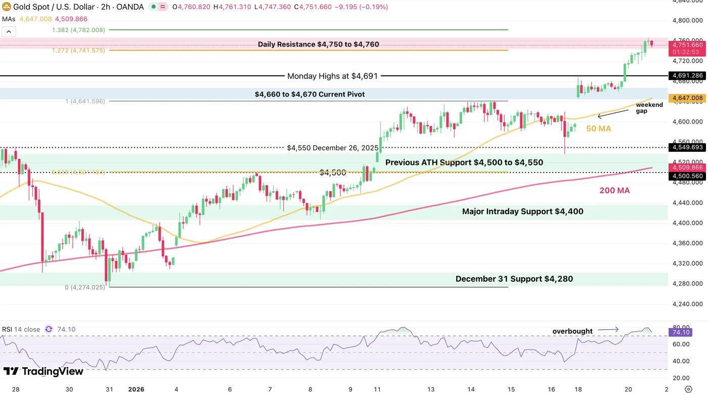 Gold had already gapped higher in yesterday’s session and continued to extend gains as US traders returned from the Martin Luther King Day holiday, now pushing toward $4,760. Silver and other metals are following suit, printing fresh highs.