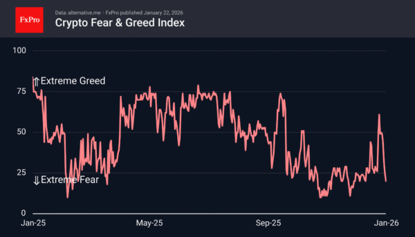The sentiment index further highlights the extreme fear, losing 41 points over the last seven days of decline. After touching the greed zone last week, profit-taking emerged. While risk sentiment improved following developments in Davos yesterday, it was not strong enough to trigger a sustainable rebound in crypto.