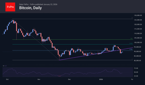 Bitcoin jumped from $87K to above $90K at the end of the day on Wednesday, but has since faced active selling as it approaches the round level, although it has not experienced significant declines due to increased risk appetite. Technically, BTC remains just below its 50-day moving average and below the former support line of the uptrend. Despite yesterday’s retreat from local lows in Bitcoin, the picture remains bearish with a higher chance of a resumption of the decline, at least to $84K, and to $80K with a more extreme downward momentum.
