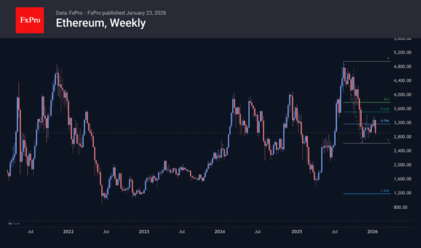 Since the beginning of the week, Ethereum has lost twice as much as Bitcoin – 12% – and is back in the November and December support zone. In May and June last year, there was active resistance from the bears here, which increased the focus on the battle for the current $2700-2900 zone. A victory for the bears at this stage could unlock a shocking scenario of ETHUSD falling to $1000–1100, with a Fibonacci extension of 161.8% from the August peak to the November low.