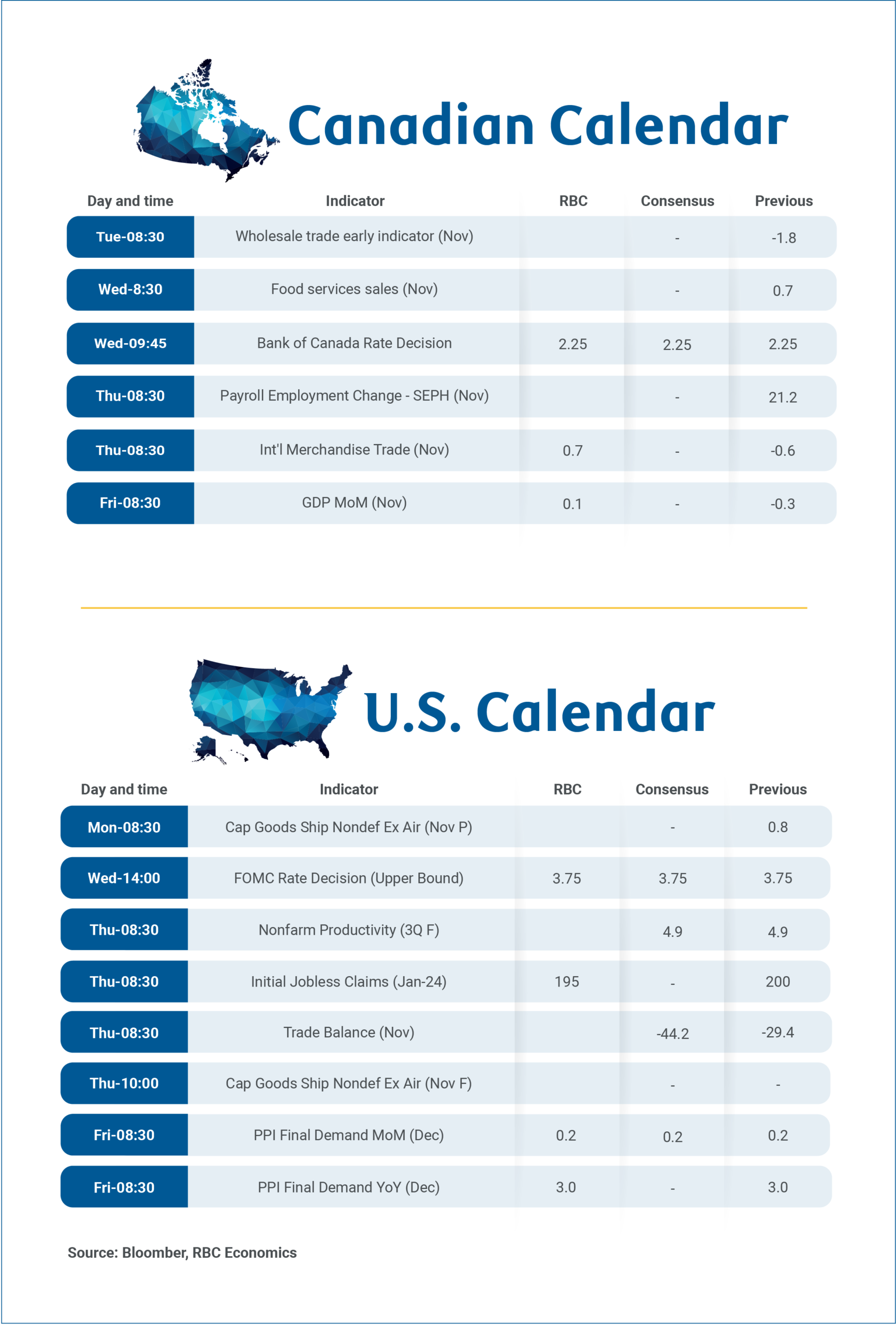 Canada’s economic calendar starts kicks off next week with the Bank of Canada’s first meeting of 2026 on Wednesday, where no change to the overnight rate is expected.