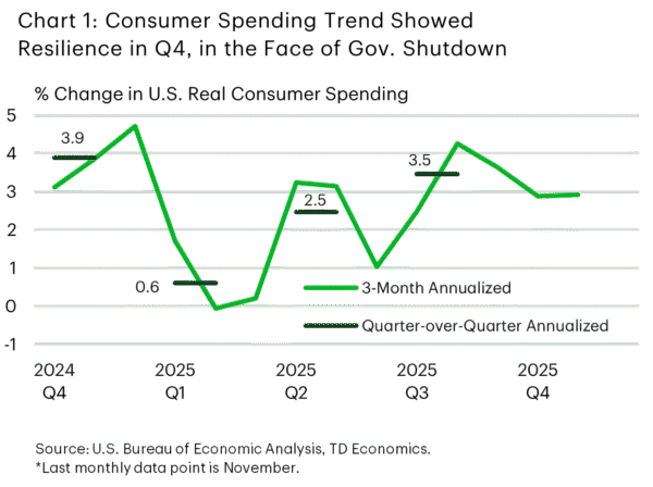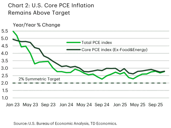 A light U.S. economic data calendar took a backseat to Greenland developments, yet the released figures highlighted resilience. The first revision to third-quarter GDP lifted annualized growth to 4.4% from 4.3%, reflecting upward adjustments in exports and business fixed investment. Consumer spending remained unchanged at 3.5%, but the trend in the fourth quarter appeared to remain healthy. The delayed October and November PCE reports pointed to greater household endurance through the extended government shutdown than initially anticipated (Chart 1). This recent data brings our tracking for consumption in the fourth quarter to 3% – stronger than previously expected. Inflation, however, tempered the positive tone. Core PCE inflation – the Fed’s preferred inflation gauge – rose to 2.8% year-over-year in November from 2.7% in October, remaining firmly above the 2% target (Chart 2).