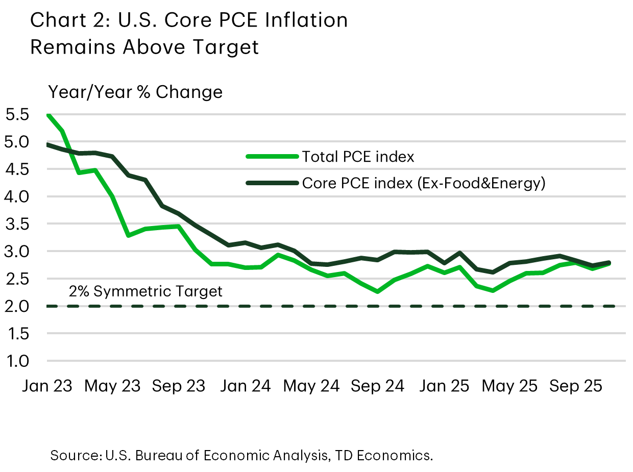 A light U.S. economic data calendar took a backseat to Greenland developments, yet the released figures highlighted resilience. The first revision to third-quarter GDP lifted annualized growth to 4.4% from 4.3%, reflecting upward adjustments in exports and business fixed investment. Consumer spending remained unchanged at 3.5%, but the trend in the fourth quarter appeared to remain healthy. The delayed October and November PCE reports pointed to greater household endurance through the extended government shutdown than initially anticipated (Chart 1). This recent data brings our tracking for consumption in the fourth quarter to 3% – stronger than previously expected. Inflation, however, tempered the positive tone. Core PCE inflation – the Fed’s preferred inflation gauge – rose to 2.8% year-over-year in November from 2.7% in October, remaining firmly above the 2% target (Chart 2).
