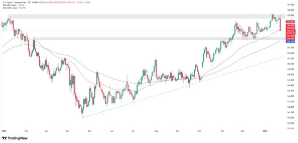 The global foreign exchange reaction underscores rising aversion to US-related risk. The Japanese yen strengthened by more than 1%, moving to around 156.14 per dollar. The move accelerated following a press conference by Kazuo Ueda, head of the Bank of Japan, and during periods of low liquidity in Europe.