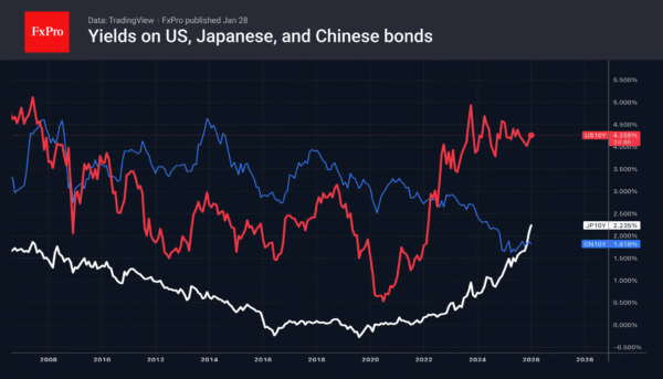 The White House is sticking to its guns. In Davos, Trump asked a rhetorical question: why is the US economy strong, the risk of default low, and interest rates higher than in other countries? The United States pays 4.2% on its 10-year debt, while Japan pays 2.2% and China 1.8%. And this is a heavy amount ticking on top of the $38 trillion debt, a staggering additional cost to the budget.