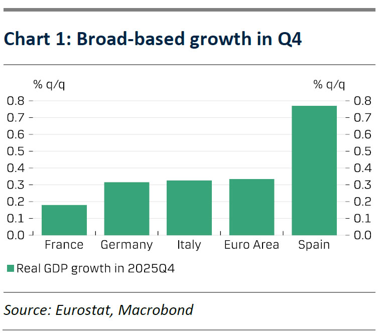 We expect the ECB to leave the deposit rate unchanged at 2.00% on Thursday in line with consensus and as priced by markets. There has been a lot of geopolitical turbulence since the December meeting but in the end, it has not changed the outlook for the ECB in our view. While uncertainty and trade barriers hurt economic activity in the long run, demand is much more important for the short-term outlook. Demand is decent as the economy grew more than expected by 0.3% q/q (consensus: 0.2%, ECB staff: 0.2% q/q) in Q4 2025 and the unemployment rate fell to 6.2%. The surprise was driven by stronger-than-expected growth in Germany, Spain, and Italy while France grew as expected – still at a modest pace (see chart 1). As growth in Q4 also seemed to be driven by private consumption and it was broad-based in the eurozone this supports the “good place” assessment of the ECB.