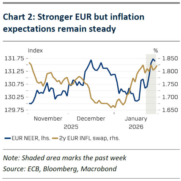Over the past week, EUR/USD has risen above the 1.19 mark breaking out of the narrow trading range of 1.15-1.17 in H2 2025. This has reignited discussions as to whether a significant strengthening of the euro would meaningfully impact imported inflation and hence become an issue for the ECB. Yet, we note that the broad euro NEER is only 0.2% stronger compared to the December meeting and 1.0% stronger compared to the cut-off date for the latest staff projections as the recent strengthening comes after a weakening over New Year (see chart 2). A paper published by the ECB shows that a 10% appreciation of the nominal effective exchange rate reduces euro area core goods inflation by 0.25ppafter one year and headline HICP by 0.06 p.p. Importantly, we also note that inflation expectations remain steady despite the strengthening (see the shaded area in chart 2) and that a broad weakening of the USD constitutes an easing of global financial conditions (see more in RtM EUR, 30 January). Against this backdrop we do not see the magnitude of the recent EUR appreciation as a cause of concern for the ECB. Lagarde will likely face question about the euro, but we expect her to provide a neutral answer saying it is one of several variables they monitor and have no target level.