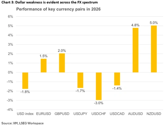 With developments elsewhere shifting the focus away from the UK, the pound has been benefiting from dollar troubles. Pound/dollar is up 2.3% in January – its strongest start to the year since 2019 – after an impressive 7.7% rally in 2025.
