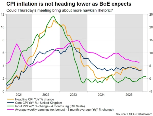 A rate cut next week would be a massive surprise, denting the pound’s recent strength against both the euro and the dollar. Similarly, a possible 5-4 voting result in favour of a pause – with Governor Baily siding with the hawks – would also threaten the pound’s current gains. On the other hand, acknowledgment of the persistent inflationary pressure might boost the pound, particularly if the quarterly inflation projections point to less steady decline over the forecast horizon.