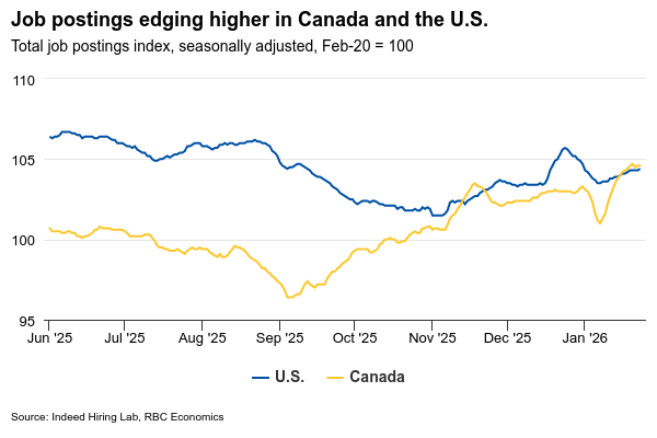 Looking ahead, Canadian firms hiring intentions remained subdued, according to the latest Bank of Canada Business Outlook Survey—and most business survey data is suggesting wage growth will edge lower. Job postings from Indeed.com, however, paint a more optimistic picture with hiring demand rising since September 2025 to levels close to the pre-tariff peak in January 2025.