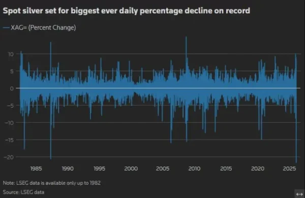 • Commodity markets saw a sharp reversal, with silver down 27%.