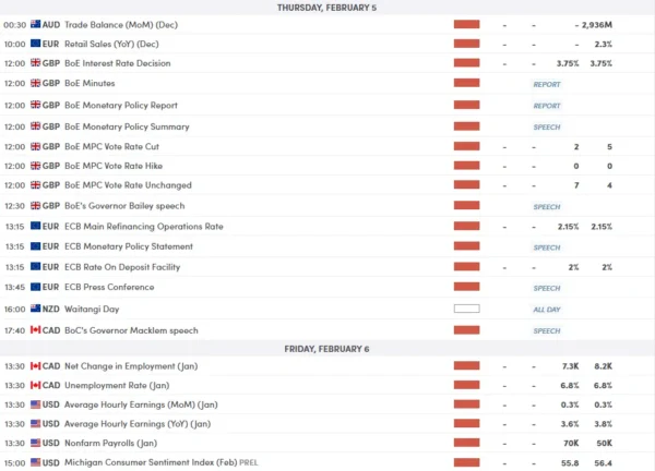 • BoE: Markets expect rates to stay on hold at 3.75%. However, with UK unemployment at a multi-year high (5.1%), traders will hunt for signals of a rate cut later in Q1 or Q2.