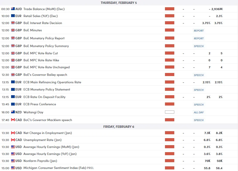 • BoE: Markets expect rates to stay on hold at 3.75%. However, with UK unemployment at a multi-year high (5.1%), traders will hunt for signals of a rate cut later in Q1 or Q2.