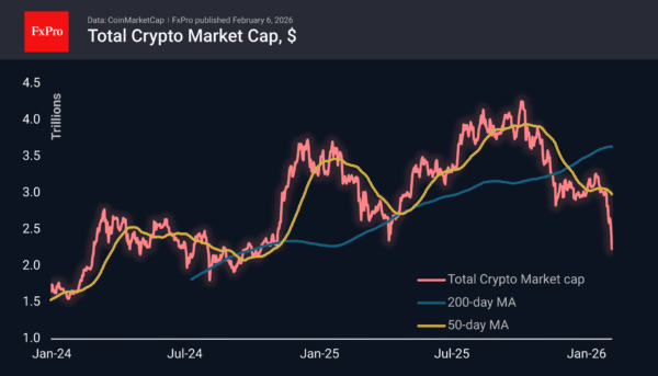 The crypto market cap has lost more than 8% in the last 24 hours to $2.22T, dropping to $2.09T at its lowest point. The Crypto fell below last April’s lows and rolled back to levels last seen in September 2024. The market did not hold on to the strong line that had served as support and resistance for more than two years. Either this is a switch to panic mode, or we saw a short-term overreaction during a period of reduced liquidity, and cryptocurrencies will partially rebound in the coming days.