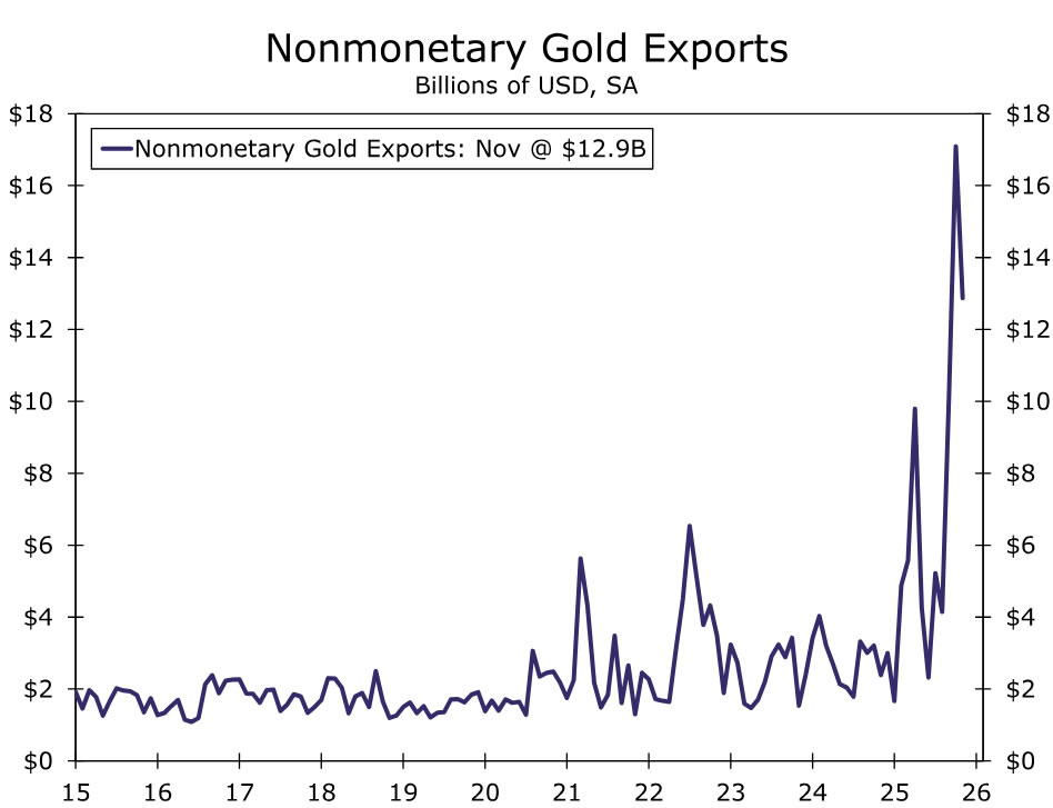 Bullion exports have been running at more than twice their typical volume. Over the past three months, an average of roughly 75 metric tons of gold bullion has left the United States each month, compared with a post‑pandemic monthly average closer to 30 metric tons. While this series has always been volatile, recent outflows have clustered near the upper end of the historical range.