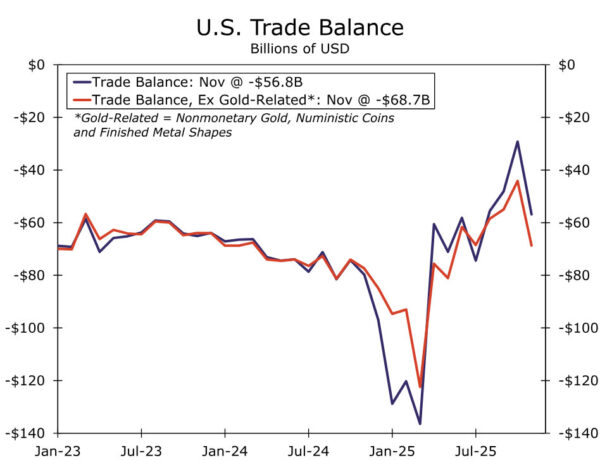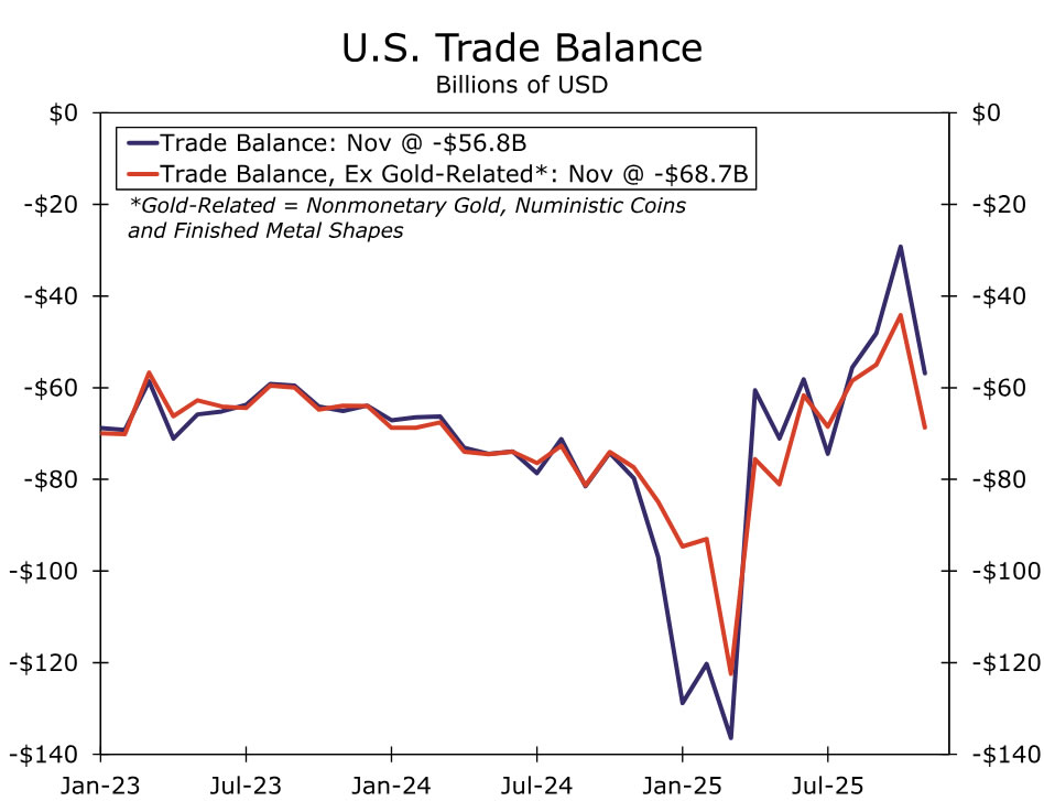 If non-monetary gold—along with a small handful of other investment‑driven categories—is excluded from both exports and imports, the trade deficit is actually wider than headline figures suggest by almost $12 billion (Figure 2).3 The gold trade has been masking ongoing imbalances rather than resolving them. A similar dynamic was at play in late 2024/early 2025, when imports of finished metal shapes surged ahead of expected tariff increases.