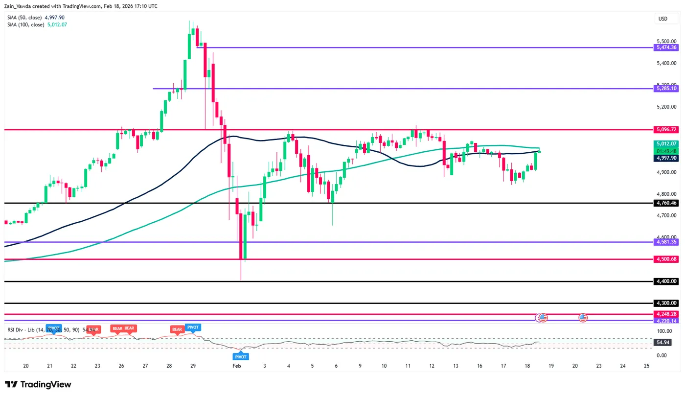 Gold (XAU/USD) Four-Hour Chart, February 18, 2026