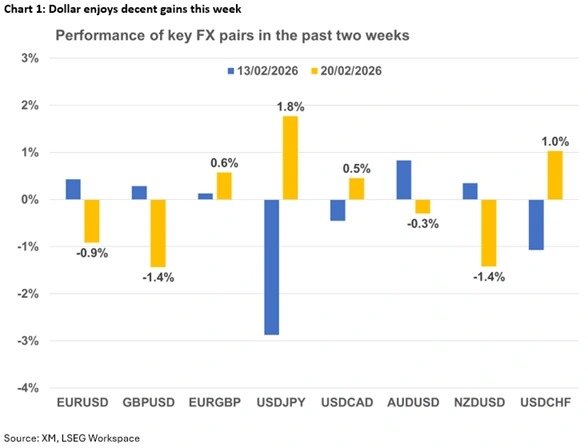 Despite markets pricing in additional easing from the Fed mid-week, the US dollar continues to perform strongly, posting gains across the FX spectrum, partly due to the geopolitical newsflow. Barring a major surprise on Friday with the announcement of the Supreme Court’s ruling on tariffs, this trend is likely to persist into the weekend if Friday’s key US data confirm the US economic strength and the lower inflationary pressures.