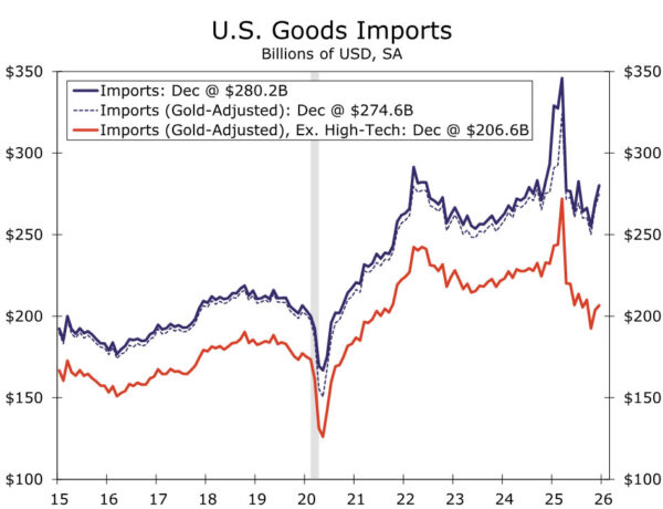 At first glance, the answer appears counterintuitive. Total goods imports increased last year, rising 4.3% above 2024 levels. But, that top line figure obscures important underlying weakness. Once gold‑related categories are excluded, the annual gain in goods imports is cut roughly in half, suggesting the headline strength overstates the true momentum in import growth.