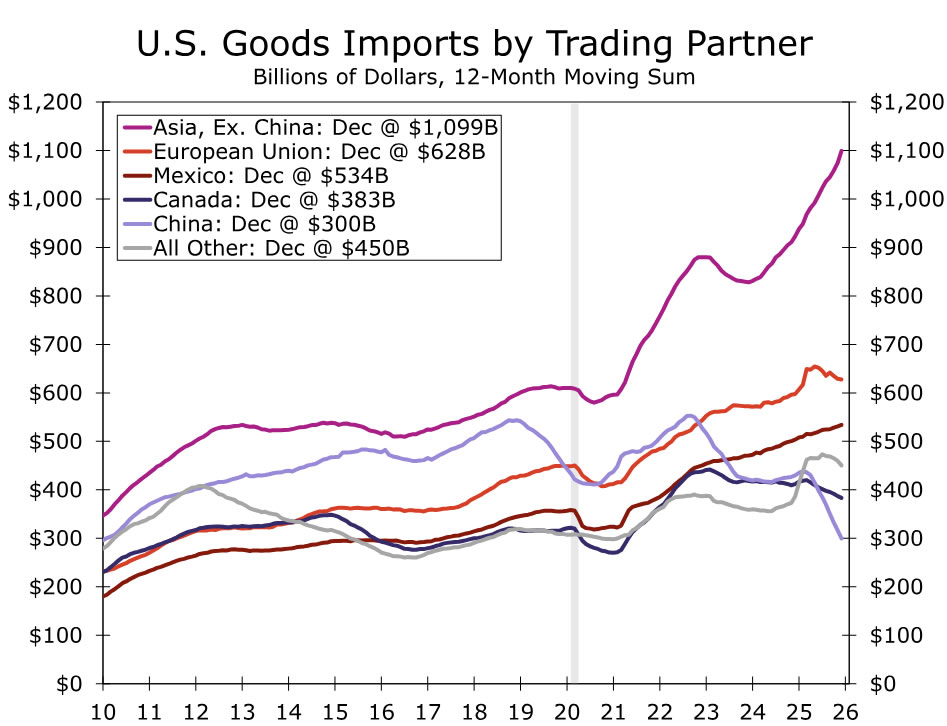 The U.S. collected nearly $265 billion in tariff revenue last year, more than three times the amount collected in 2024. Measured against total imports that means the realized average effective tariff rate rose to roughly 8% last year, up from just under 3% the year prior. With a full year of data now available, the key question is how this dramatic increase in tariffs ultimately affected U.S. import behavior.