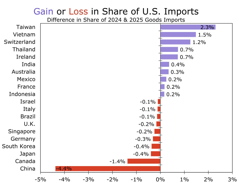 Tariffs also coincided with notable shifts in the geographic composition of U.S. imports. As shown in Figure 2, imports from China declined sharply, while shipments from other Asian economies increased. Figure 3 highlights the countries that gained—and lost—share of U.S. imports over the year. In particular, Taiwan, Vietnam and Thailand more than offset the decline in imports from China, at least in aggregate terms.