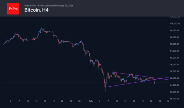 The crypto market cap has lost about 3.5% over the past 24 hours to $2.25 trillion. At its lowest point at the start of the day, the price fell to $2.22 trillion, which is not far from the lows of February 5–6. It seems that bears have gathered enough strength to try to complete the consolidation of the last couple of weeks during the hours of lowest liquidity. Among the top coins, Solana and Bitcoin Cash are taking the biggest hit, losing over 7%, while Tron is doing better than most, losing only 0.3%.