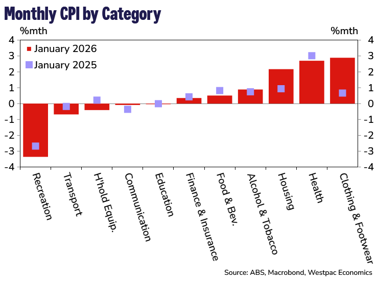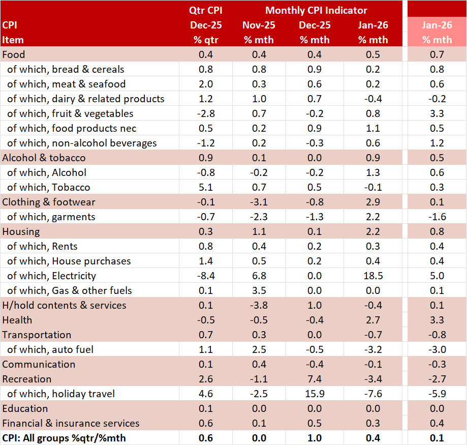 We start 2026 with a complete Monthly CPI. In January the CPI gained 3.8% in the year, a touch stronger than Westpac’s estimate of 3.6%yr and the market estimate of 3.7%yr. In the month, the CPI lifted 0.4%, stronger than Westpac’s published near-cast of 0.1% on the back of stronger than expect gains in electricity and garments & footwear offset somewhat by a larger than expected fall in holiday travel and a smaller than expected rise in health.